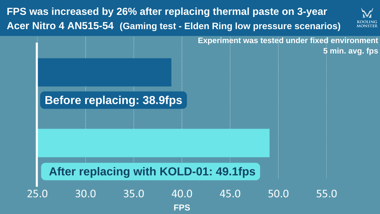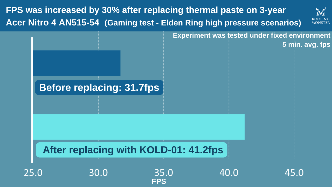 Durante escenarios de juego de alta presión (como durante el combate), la tasa de fotogramas aumentó de 31,7 FPS a 41,2 tras cambiar la pasta térmica.