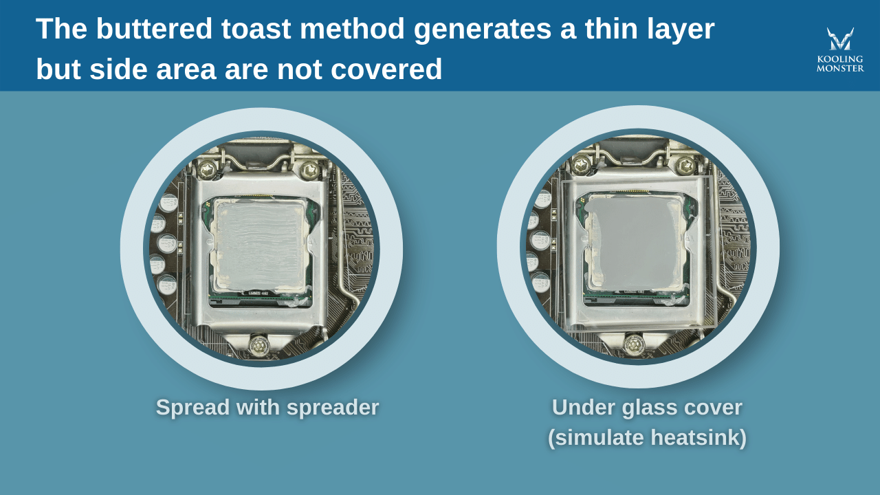 Mientras que los otros métodos de aplicación dependen de que el disipador extienda la pasta con presión al reasentarse, el método de la tostada con mantequilla requiere que el usuario extienda la pasta con un spreader o espátula.
