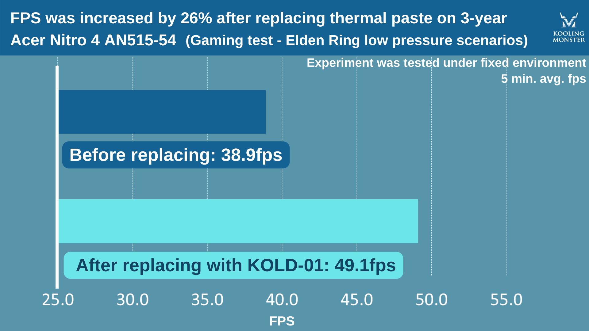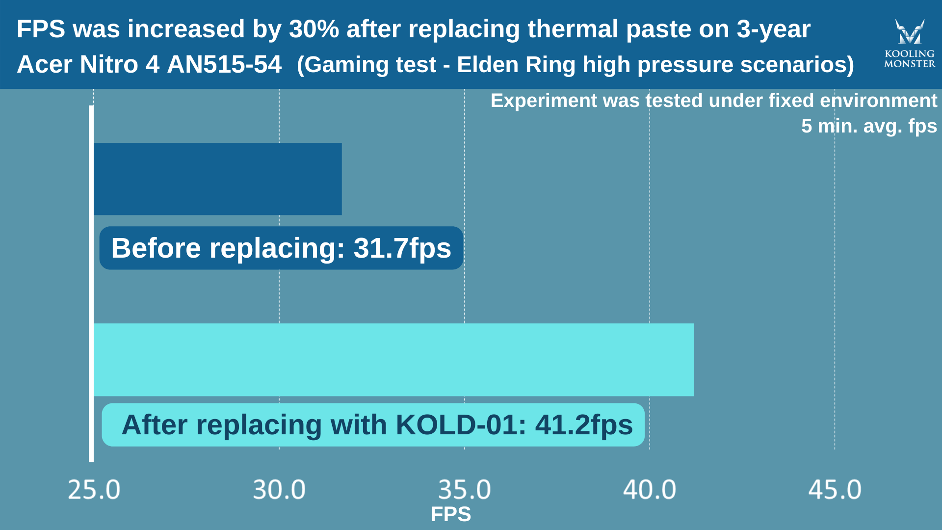 Durante escenarios de juego de alta presión (como durante el combate), la tasa de fotogramas aumentó de 31,7 FPS a 41,2 tras cambiar la pasta térmica.