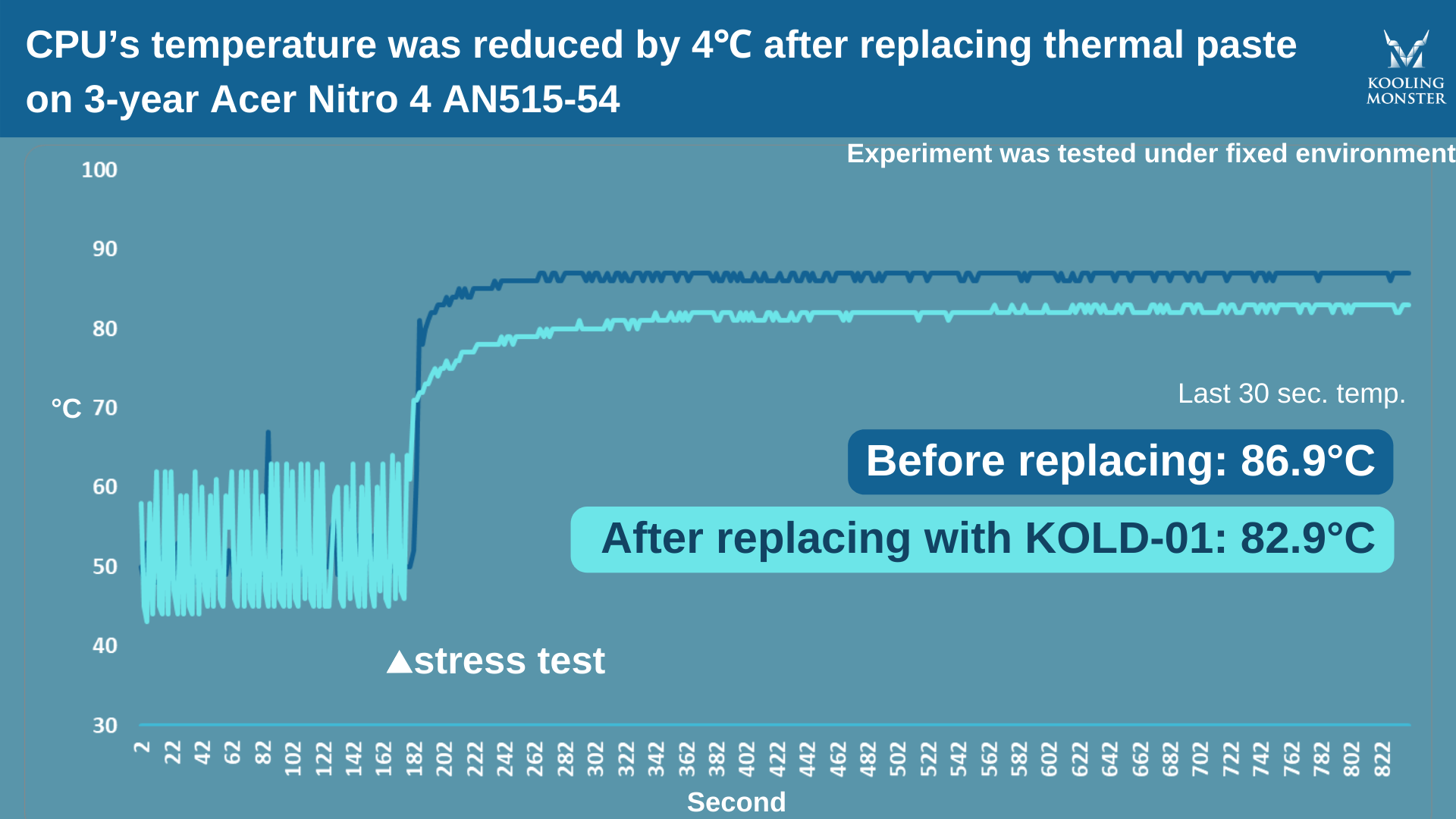 Para que quede más claro, hicimos pruebas de estrés en un Acer Nitro 4 AN515-54 de 3 años, antes y después de aplicar la nueva pasta térmica. Para la prueba usamos nuestra propia pasta térmica Kooling Monster KOLD-01.
