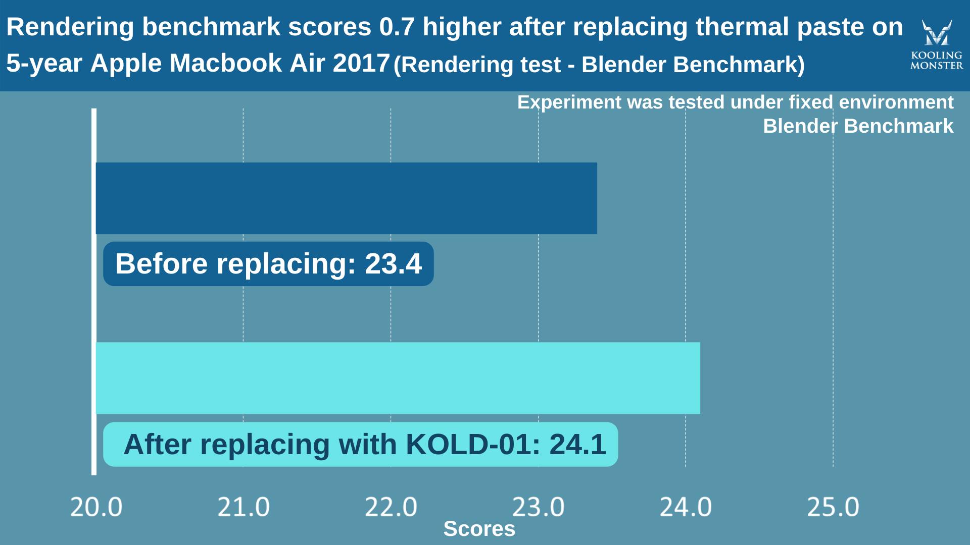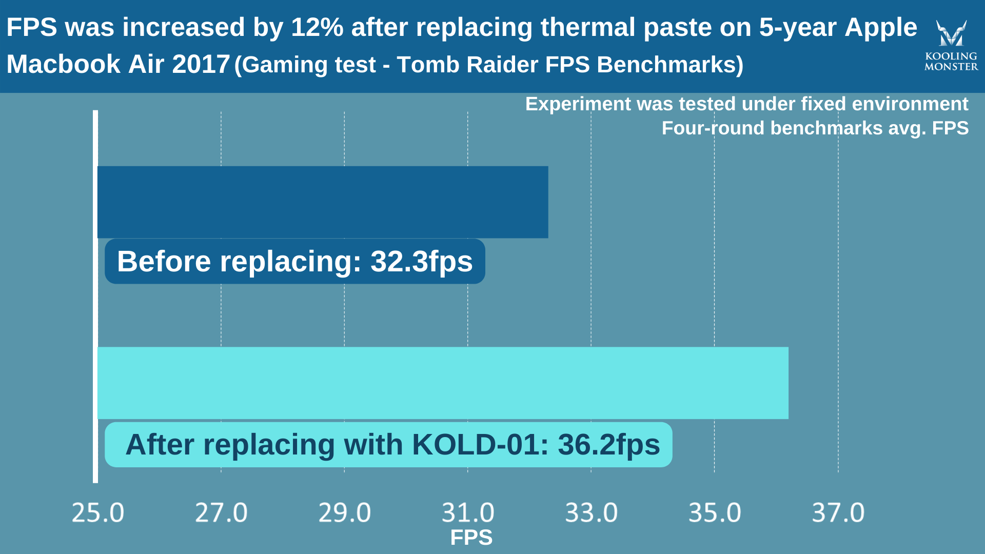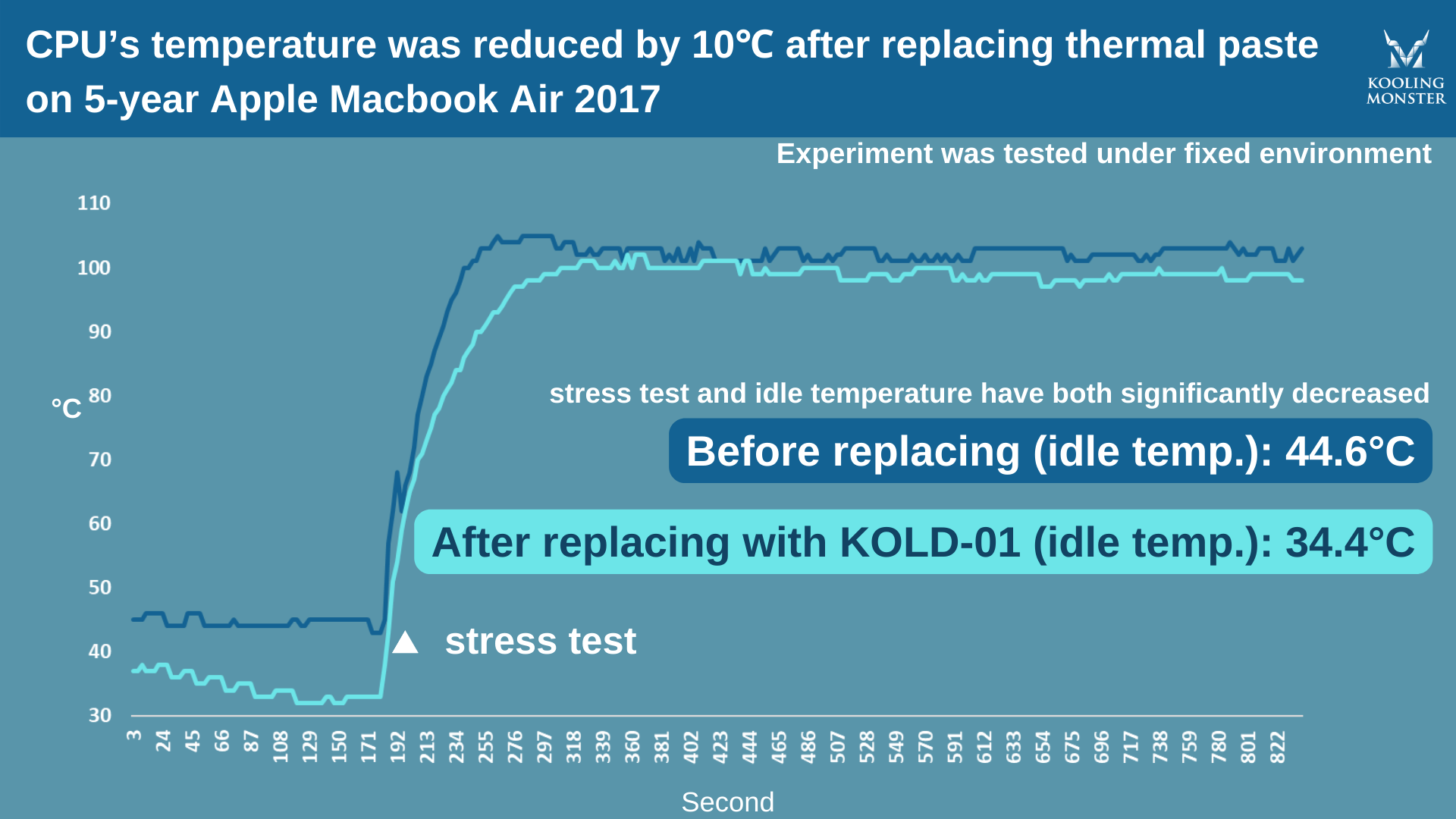 Para que quede más claro, hicimos pruebas de estrés en un Apple MacBook Air 2017 de 5 años, antes y después de aplicar la nueva pasta térmica. Para la prueba usamos nuestra propia pasta térmica Kooling Monster KOLD-01.