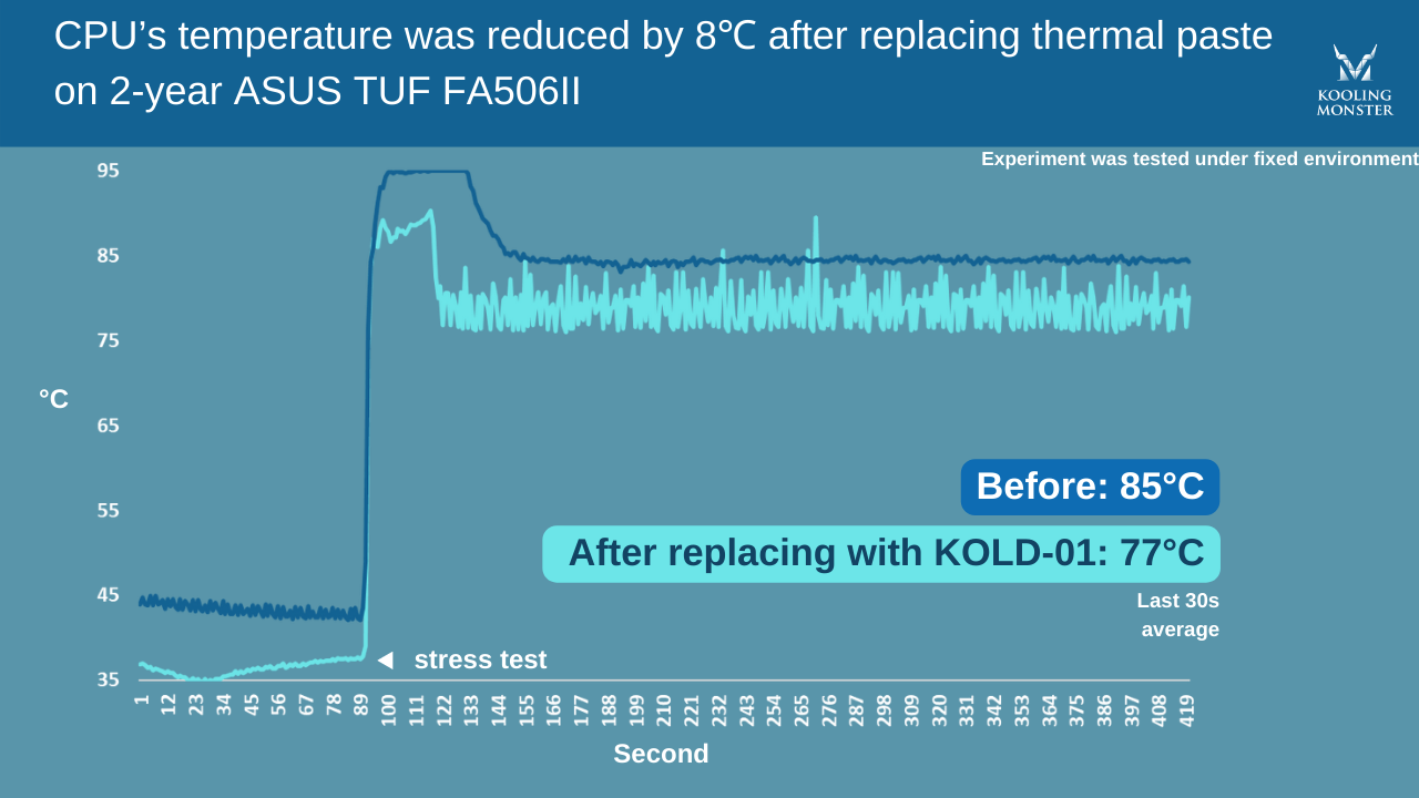 Para que quede más claro, hicimos pruebas de estrés en un ASUS TUF Gaming FA506II de 2 años, antes y después de aplicar la nueva pasta térmica. Para la prueba usamos nuestra propia pasta térmica Kooling Monster KOLD-01.
