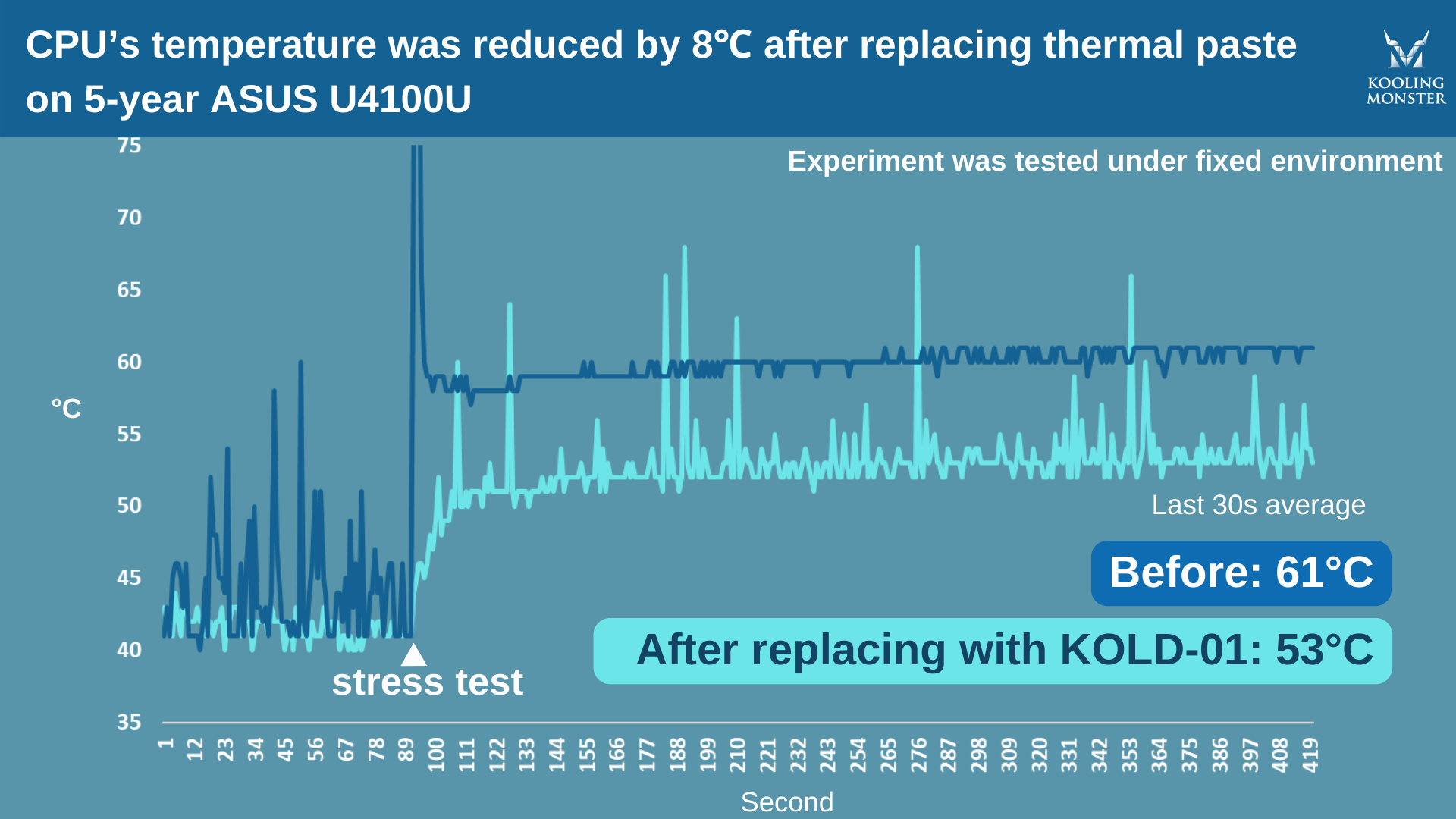 Para que quede más claro, hicimos pruebas de estrés en un ASUS ZenBook U4100U de 5 años, antes y después de aplicar la nueva pasta térmica. Para la prueba usamos nuestra propia pasta térmica Kooling Monster KOLD-01.