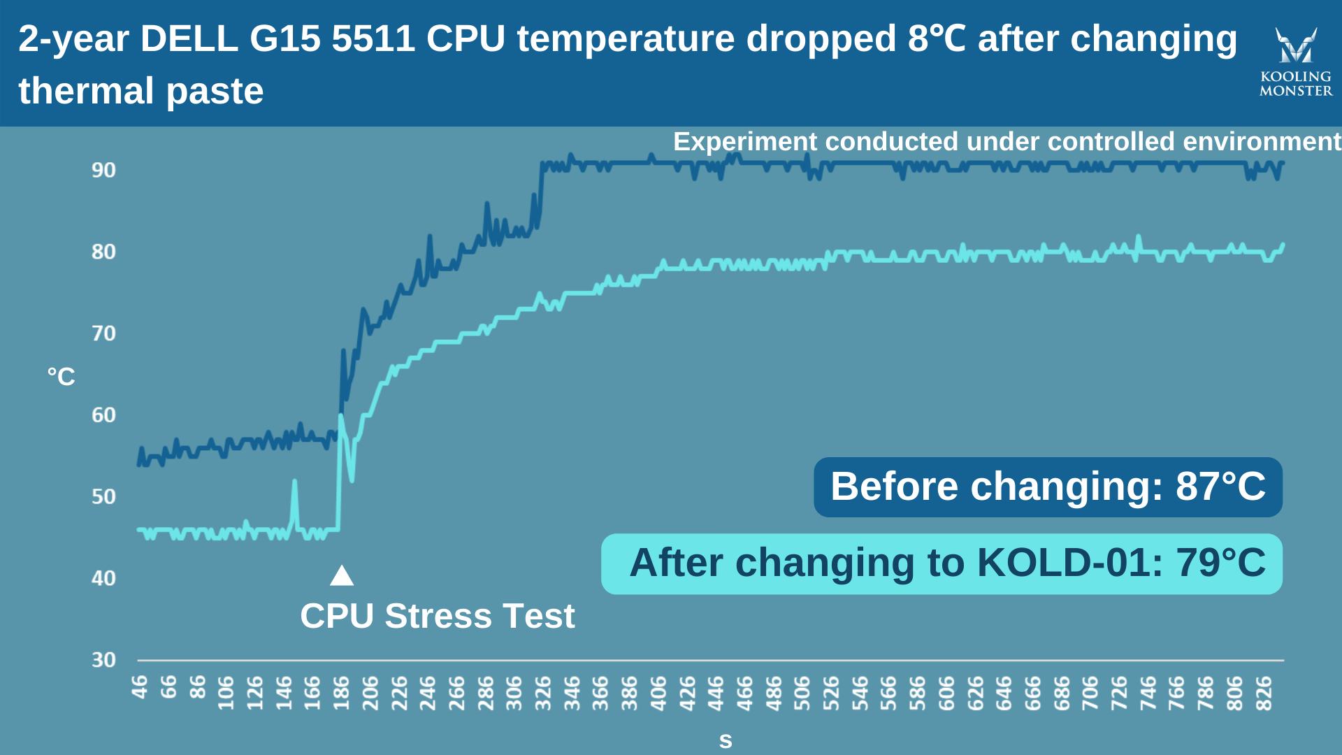 Para que quede más claro, hicimos tests de estrés en un portátil DELL G15 5511 de 2 años antes y después de aplicar la nueva pasta térmica. Para esta prueba usamos nuestra propia pasta térmica Kooling Monster KOLD-01.