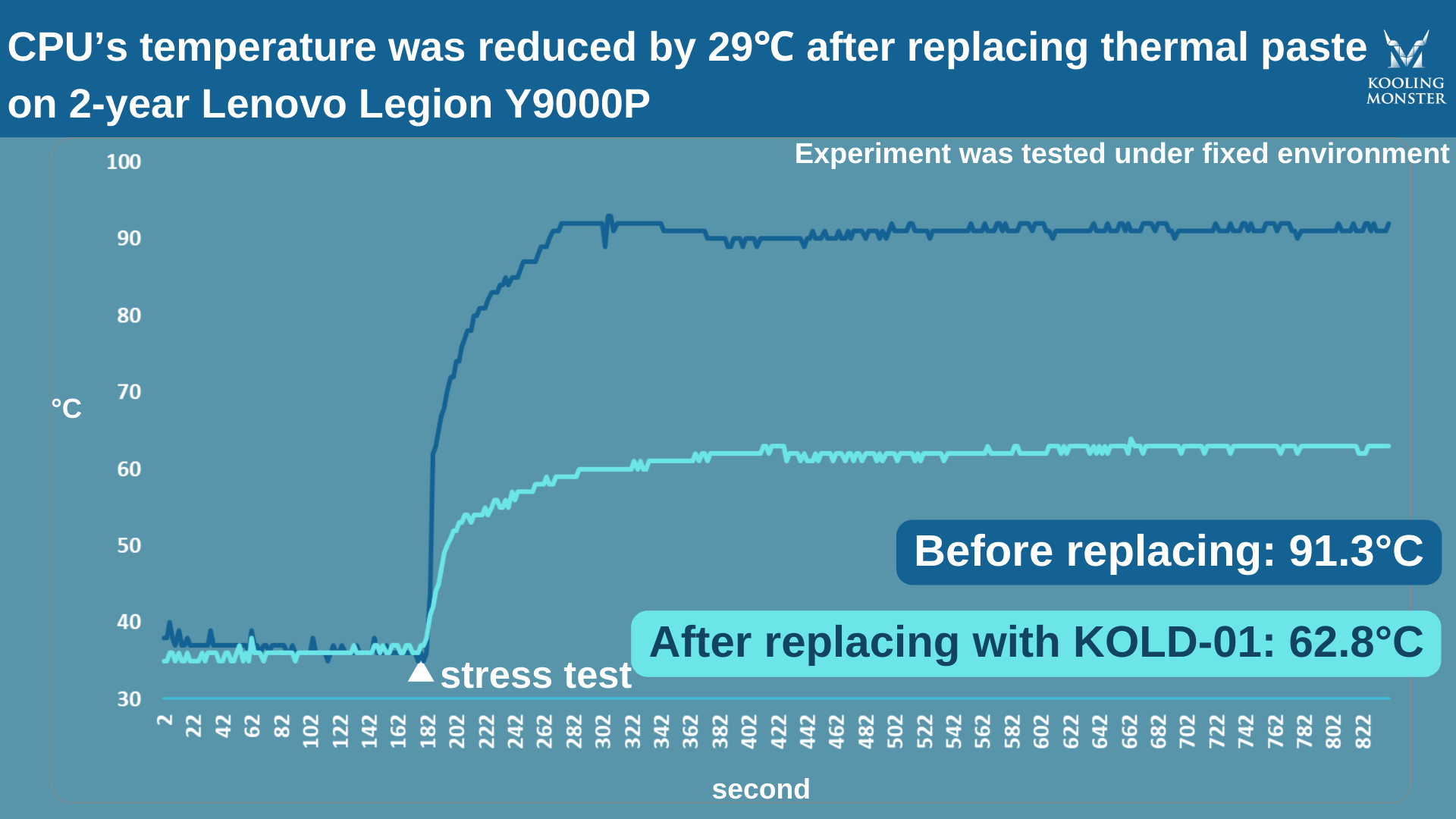 Para que quede más claro, hicimos tests de estrés en un Lenovo Legion Y9000P 2021H de 2 años antes y después de aplicar la nueva pasta térmica. Para esta prueba usamos nuestra propia pasta térmica Kooling Monster KOLD-01.